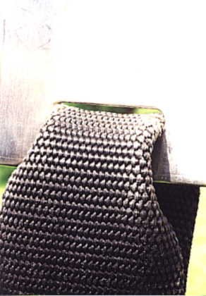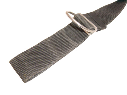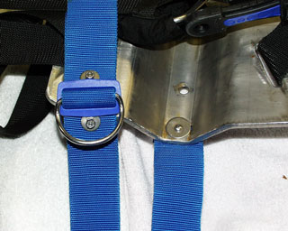 This is Jim Cobb's crotch strap done with stainless steel bolts, carrage washers and nylock nuts. I know thats a plastic weight retainer but all it's there for is to keep the tow ring in position, nothing more. You cut holes in the webbing using a large nail heated with a propane torch.