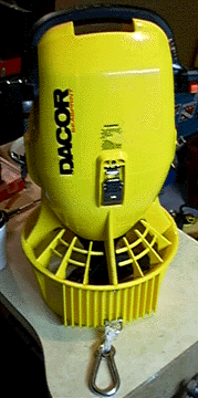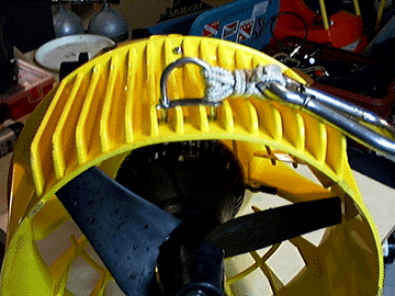The control handles are up at the front which means that the standard Mako/Gavin harness does not work. So the hot setup is to put a tow clip on the fan shroud to clip to your crotch ring. This setup is not too good for caves but for wreck diving it is ideal. The scooter is negative and with this setup you can keep it attached to your harness for the whole dive. If you need to use your hands you just let go and the scooter flops down between your legs. When you need the scooter you just kick up one knee and up it pivots into position. Neat!