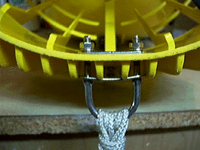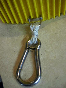 While you can put the carabeaner directly on the loop but this would constitute a metal-to-metal contact. And you can adjust the string attachment for length to position the scooter correctly. The fitting is a standard blow-boat fixture and can be found at West Marine or similar stores. Make sure you use lock washer or NyLok nuts. I use the carabeaner because I need to be able to clip the scooter off on the anchor line or the hang bar. But you could use a double-headed bolt snap as well if you did not want the adjustablility.
