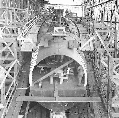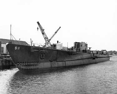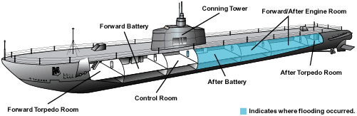 Later that day another attempt was made to float the sub. The stern was blown dry with compressed air. All the water in the hull rushed to the forward part of the vessel and the sub sank.