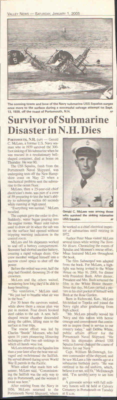 "Delay again dogs Squalus salvage crew:" Such was a headline in a Portsmouth paper after the sub was docked temporarily. "The stern of the submarine, berthed at the Navy Yard pier, sank below the surface." The sea was still reluctant to give up its dead. Later that night the salvage crew finally won out against her. The stern was raised and the vessel put on an almost even keel. A few minutes before midnight the doomed shipmates were removed from the vessel.