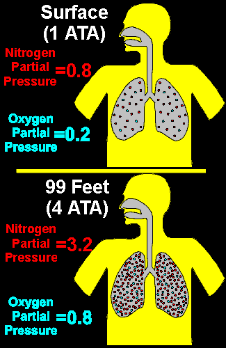 To understand the physiological ramifications of breathing various gas mixtures under pressure, it is useful to understand the concept of partial pressure. The partial pressure of a particular gas constituent in a gas mixture is a representation of the portion of the total pressure of the gas mixture exerted by the particular constituent. If you add up all the partial pressures of all the different components of a gas mixture, their total would be equal to the total pressure of the mixture. As confusing as this may sound, partial pressures are actually quite easy to calculate: all you need to know is the fraction of each gas constituent in the mixture, and the total pressure of the gas mixture. For example, consider a person breathing air (a gas mixture containing approximately 80% nitrogen and 20% oxygen) at sea level. As discussed earlier, the ambient pressure at the sea surface is 1 ATA. Therefore, the pressure of the air which the person inspires is also 1 ATA. To get the partial pressure of nitrogen in the inspired air, simply multiply the fraction of nitrogen in the breathing mixture (80%) by the total pressure (1 ATA), and you calculate a nitrogen partial pressure of 0.8 ATA. Similarly, multiplying 20% oxygen times 1 ATA results in an oxygen partial pressure of 0.2 ATA. Now consider what happens when that same person descends to a depth of 99 feet (30 meters), where the ambient pressure is 4 ATA. In order for that person to be able to breathe at all, the inspired air pressure must be the same as the ambient pressure. Therefore, the inspired partial pressure of nitrogen is 80% times 4 ATA, or 3.2 ATA. The oxygen partial pressure is 20% times 4 ATA, or 0.8 ATA. At 99 feet (30 meters), the ambient pressure is four times greater than it is at the surface, and the partial pressures of each of the gases is also four times greater (although the percentages of each gas are the same in both cases). As discussed early, the gas molecules are more closely packed when under pressure; at a depth of 99 feet (30 meters), there are four times as many gas molecules (both nitrogen and oxygen) in a lung-full of air as there are at the surface. An easy way to think of partial pressures of gases is that the partial pressure represents an absolute concentration of that gas, regardless of depth or pressure. If a person breathed a gas mixture containing 80% oxygen at the surface, the oxygen partial pressure would be 0.8 ATA, which is exactly the same partial pressure of oxygen when breathing air at a depth of 99 feet (30 meters). In both cases (80% oxygen at the surface and air at 99 feet/30 meters), the concentration of oxygen molecules in the lungs (i.e., the total number of oxygen molecules in the lungs on each inhaled breath) is the same. Just a word on notation: in their gaseous forms, both oxygen and nitrogen are binary molecules; that is, they are bound in pairs of atoms. An oxygen gas molecule consists of two oxygen atoms bound together, and a nitrogen gas molecule consists of two nitrogen atoms bound together. The notation for oxygen is the letter "O", so oxygen gas is referred to as "O2"; the subscript "2" indicating two atoms of oxygen. Similarly, nitrogen gas is referred to as "N2", and carbon dioxide as "CO2". When discussing partial pressures of gases, the gas notation is usually prefaced by a capital "P". Thus, "oxygen partial pressure" is written as "PO2", and "nitrogen partial pressure" is written as "PN2".