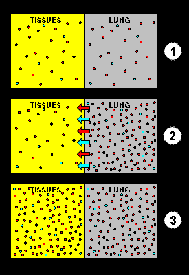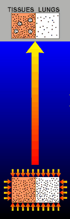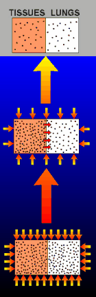 Henry's Law states that "The amount of any given gas that will dissolve in a liquid at a given temperature is a function of the partial pressure of that gas in contact with the liquid..." What this means for divers is that gas molecules will dissolve into the blood in proportion to the partial pressure of that gas in the lungs (as "warm-blooded" creatures, our core body temperature remains relatively constant). In the diagram at right, the top figure (1) represents a close-up of the interface between the lungs and the blood and tissues of a diver. At sea level, the dissolved gases in the blood and tissues are in proportion to the partial pressures of the gases in the person's lungs at the surface. As the diver descends underwater, the ambient pressure increases, and therefore the pressure of the gas inside the lungs increases correspondingly. Because the partial pressures of the gases in the lungs are now greater than the dissolved partial pressures of these gases in the blood in tissues, gas molecules begin to move from the lungs into the blood and tissues (represented by the blue and red arrows in the middle figure, 2). Eventually, the concentration of the dissolved gases in the blood and tissues will be proportional to the the partial pressures in the breathing gas (i.e., a state of equilibrium). The physiological complexities of "Ambient Pressure Diving" are a direct result of the effects of these increased dissolved concentrations of gases in the blood and tissues, and how those increased concentrations affect the way our bodies work.