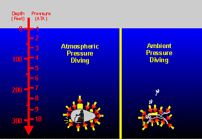 Pressure Like air, water causes pressure by its weight. But of course, water is considerably denser (i.e., heavier for a given volume) than air. As it turns out, a column of sea water one inch in cross-section would need to be only about 33 feet (10 meters) tall to weigh 14.7 pounds. Therefore, at a depth of 33 feet (10 meters) beneath the sea surface, the total ambient pressure is about 29.4 psi, or 2 ATM -- 1 ATM caused by the weight of the air in Earth's atmosphere, plus 1 ATM for the weight of 33 feet (10 meters) of seawater. To avoid confusion, when people discuss pressures underwater, the unit "ATA" (referring to "atmospheres absolute") is often used to represent the total, "absolute" pressure caused by both the water and the air above the water. As is illustrated in the diagram at right, the ambient pressure increases underwater at an almost linear rate with increasing depth*. For every 33 feet (10 meters) of depth in sea water, the ambient pressure increases by an an additional 14.7 psi (1 atm). At a depth of 99 feet (30 meters), the ambient pressure is 4 ATA -- one ATM caused by the Earth's atmosphere, plus 3 ATM for every 33 feet (10 meters) of depth. Similarly, the ambient pressure 297 feet (90 meters) beneath the surface is 10 ATA. The problem with the long-snorkel idea has to do with the fact that the muscles we use to expand and contract our lungs during breathing are not strong enough to overcome much pressure. Even just a few feet beneath the surface, the pressure is great enough that we cannot expand our lungs against the water pressure to inhale a breath of air from the surface. Our bodies simply are not designed to do that. One way to overcome this problem is to protect the diver's body from the ambient pressure. "Atmospheric Pressure Diving" technology, the most familiar of which are deep sea submersibles, do exactly that. The pressure on the inside of a submersible is maintained at 1 ATA - the same pressure that we experience at the sea surface. Underwater, the increased ambient pressure acts on the hull of the submersible, not the diver inside. Thus, the person inside the submersible is protected from the ambient pressure at all times and has no difficulty breathing. Another way to overcome the problem of breathing under pressure is to provide a pressurized breathing gas mixture to the diver. If the breathing gas supply is delivered at the same pressure as the surrounding ambient pressure, the diver's lungs do not have to work against the water pressure (i.e., the pressure in the surrounding water and the pressure in the inhaled gas supply are balanced). However, when using this sort of "Ambient Pressure Diving" technology, the diver's body is directly exposed to the ambient pressure. More importantly, the gas inhaled into the diver's lungs is pressurized. To understand the physiological ramifications of this, it's important to understand the effects of increased pressure on gases. As mentioned above, gas is composed of molecules. As the pressure of the gas increases, these molecules (which are in constant motion) get packed more closely together. At a higher pressure, a given number of gas molecules will occupy a smaller volume (or a given volume will be occupied by a larger number of gas molecules). For example, if you had a balloon filled with gas at the surface, and then pulled that balloon underwater, the balloon would shrink in size. In fact, if you brought the balloon down to a depth of 33 feet (10 meters), it would be half the size it was at the surface. At 66 feet (20 meters) it would be one-third the size it was at the surface; at 99 feet (30 meters) it would be one fourth the size, and so on. If, at a depth of 99 feet (30 meters), you wanted to expand the balloon to its original size, you would have to fill it with four times as many gas molecules as were required at the surface. Returning the re-inflated balloon back to the surface would cause it to grow to four times its original size. It doesn't require much imagination to understand what would happen to a diver's lungs if he or she took a full breath at depth, and held it while ascending to the surface. This is why the golden rule of diving is "never hold your breath". People who forget this rule (for example, in a state of panic), run the risk of suffering from ruptured lungs, allowing gas bubbles to directly enter the blood. It's called embolism, and it can lead to serious symptoms including paralysis and death. A key point here for understanding other aspects of diving physics and physiology, is to realize that the greater the pressure, the more tightly packed (i.e., more highly concentrated) gas molecules are. *Note: Because water is very slightly compressible, the relationship between depth and pressure is not exactly linear all the way to the bottom of the sea; however, for the purposes of diving technology, the deviation from a linear relationship is trivial.