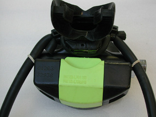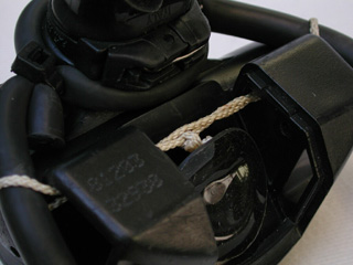 You have to make a necklace with the surgical tubing and the zip ties. I guess everybody know how to do it, no big deal, huh? Then, take a piece of cave line (braided nylon twine #24) and make a loop passing inside the exaust tee (fig.1). In the Scubapro line of regulators, you can acess the exaust valve by taking part of the reg tee off (fig.2). It's easier to knot. As the picture show, the line also holds the necklace firmly in place.