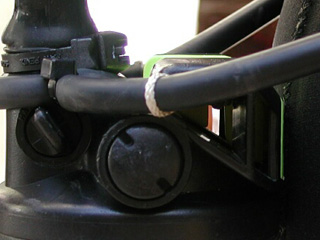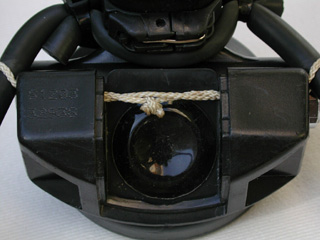 The line can also hold the exaust valve partially closed. It would cause a increase in your WOB (Working Of Breathing), which could lead to hypercapnia, with desastrous results. I would advise against taking this mod right to your big dives. After arriving to this design, I tested it for several hours in no-stop dives. That was when I discovered the open exaust problem. When testing, be aware for any incresed WOB. As shown in fig.5, if properly placed, the line keeps out of the way of the exaust valve.