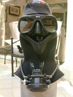 I don't know if this method could be used with other brands than Scubapro, specially with the Apeks line, which is very popular with the Techdiver crowd. But as the pictures show, it works very well on Scubapro regulators!! (Yes, that's a AL80 with a hood and mask...)