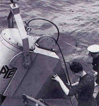 Getting the diver down to the float valve, which rested in the sea bed directly under the listing conning tower, posed complications, the diver having to pass through the extended after periscope and telescopic radar aerial, very close to a tangle of lose radio aerials.